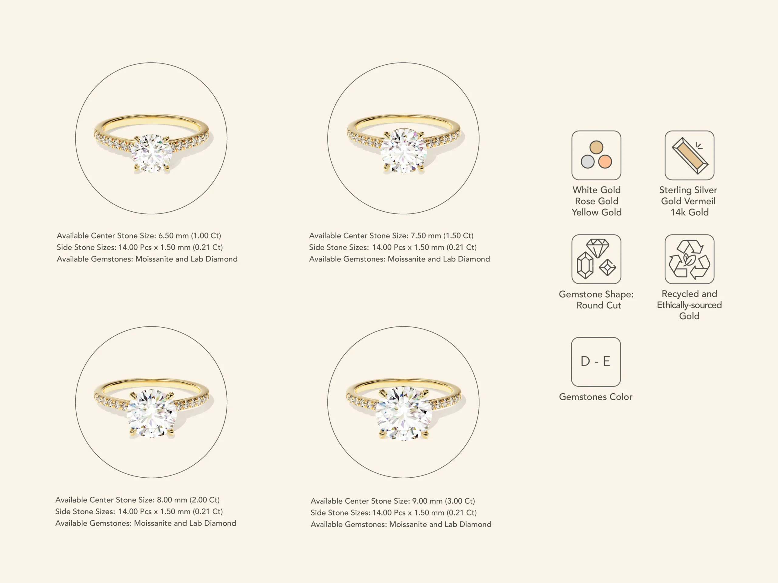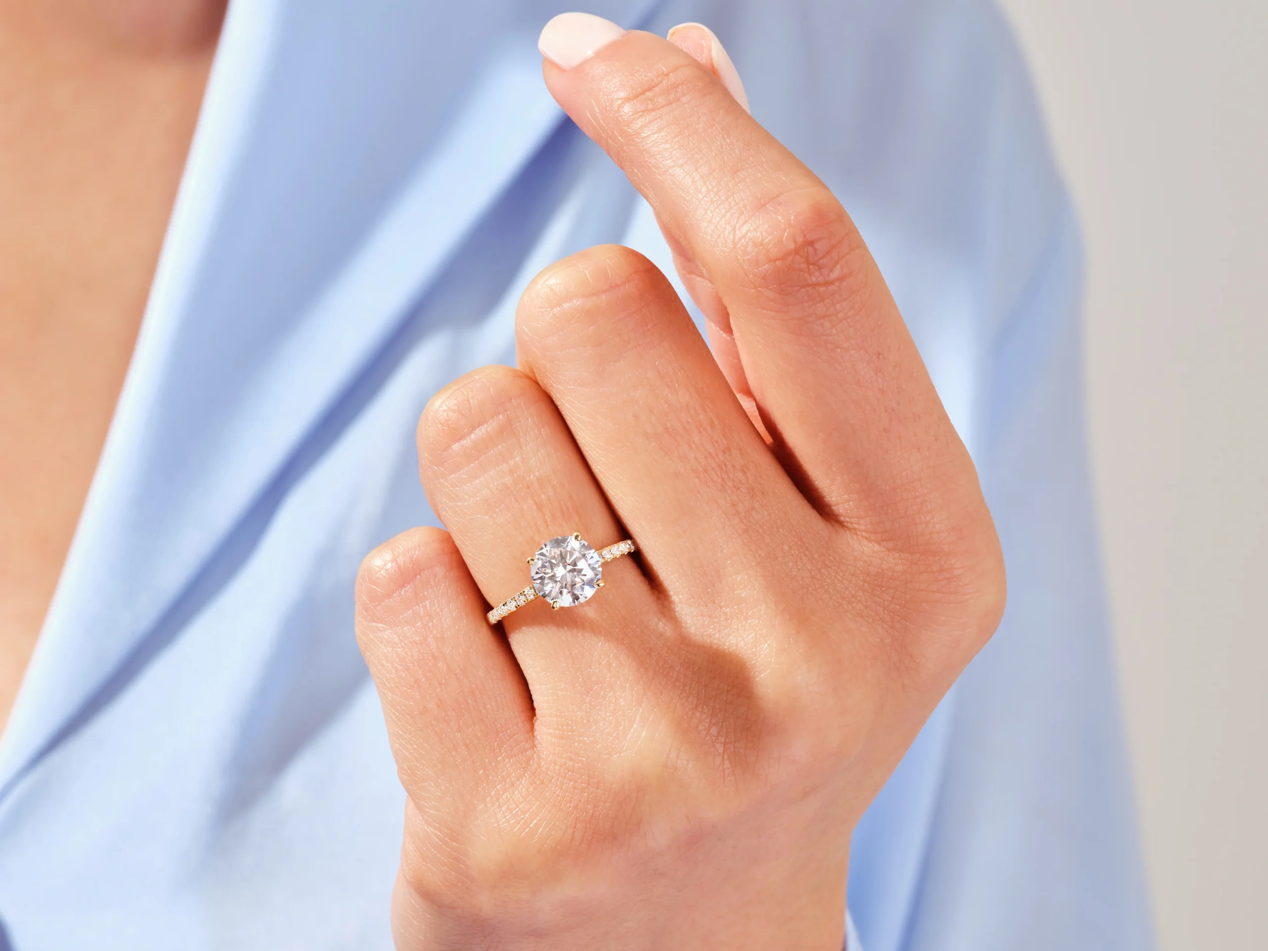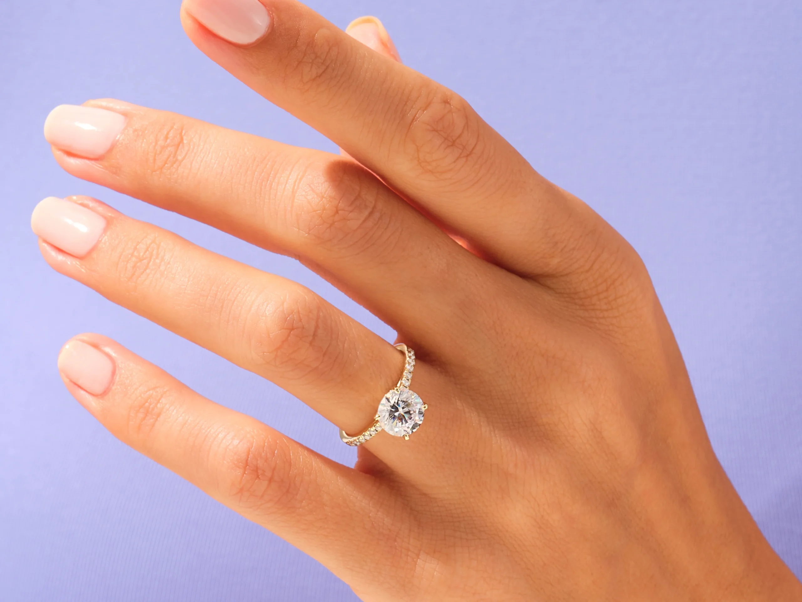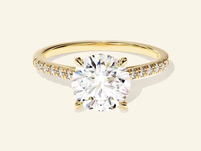 Zarafetin kalıcı bir ifadesi olan bu yuvarlak kesimli, yanlarında pave taşlarla süslenmiş nişan yüzüğü, 14 ayar som altın, altın kaplama veya gümüşten özenle üretilmiştir. Parlak 2 karatlık yuvarlak kesimli taşı, her an laboratuvar ortamında üretilmiş elmas veya moissanit taşının sessiz özgüveniyle parlamak üzere tasarlanmış ince ve zarif bir bant üzerinde yer almaktadır. İster aşkın sembolü, ister bir dönüm noktasının kutlaması, isterse de her gün değer verilecek bir parça olarak hediye edilsin, bu yüzük kalıcı güzellik ve anlam sunar.